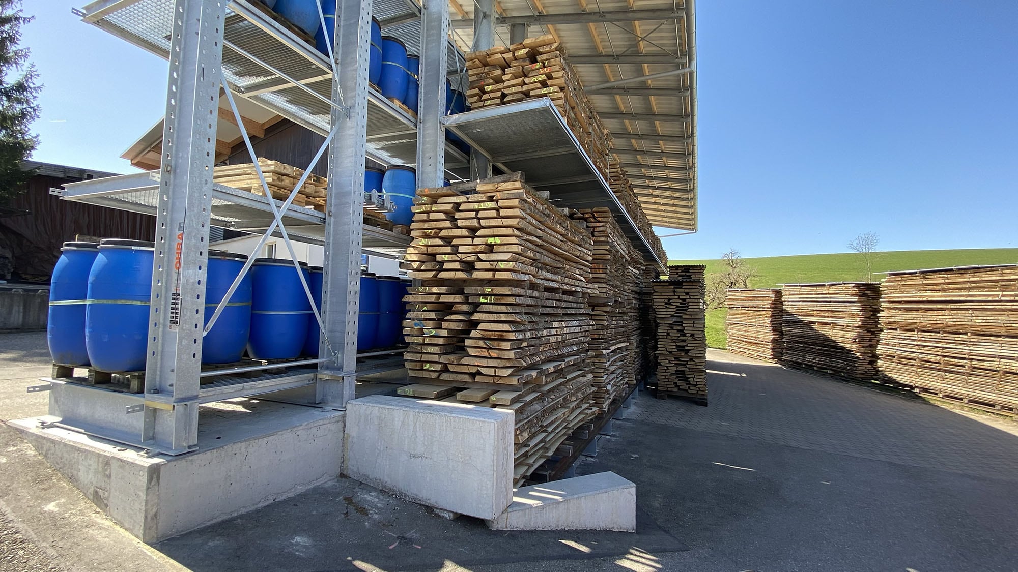 Tot nu toe had Nyfeler beukenblokken opgeslagen, die de schrijnwerkerij gebruikte voor de productie van de CUBORO-knikkerbaansystemen, evenals brandhout en andere items die buiten worden gestapeld. Maar de europallets die voor dit doel werden gebruikt, raakten voortdurend verweerd, wat resulteerde in gevaarlijk scheve stapels. Om bij de goederen te komen, moesten de artikelen ook voortdurend opnieuw worden gestapeld. Om ze tegen het weer te beschermen, dekte Nyfeler ook elke stapel met zeildoeken af, wat voor veel extra handelingen zorgde. Tenslotte nam het magazijn een te grote oppervlakte in beslag.